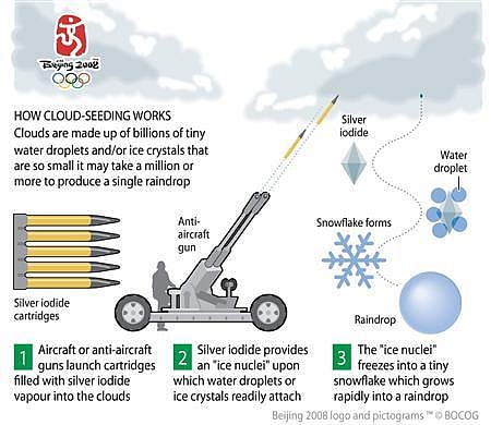 இந்த கெமிக்கல் மேகங்களில் உள்ள நீர்த் துளிகளை ஒன்றிணைத்து மழையாக பொழிய வைக்கும். இப்படி அனைத்து மேகங்களும் முன்னரே மழையாகக் கொட்டிவிட்டால் விழா சமயத்தில் மேகமே இருக்காது. இப்படி மேக மூட்டத்தை இல்லாமல் செய்வது 'ப்ளு ஸ்கையிங்' என அழைக்கப்படுகிறது. இந்த முறையை சீன அரசு 2008 முதலே பெய்ஜிங்கில் நடந்த ஒலிம்பிக் உட்பட பல்வேறு பொது நிகழ்ச்சிகள் நடைபெறுவதற்கு முன்பாக பயன்படுத்தியிருக்கிறது.