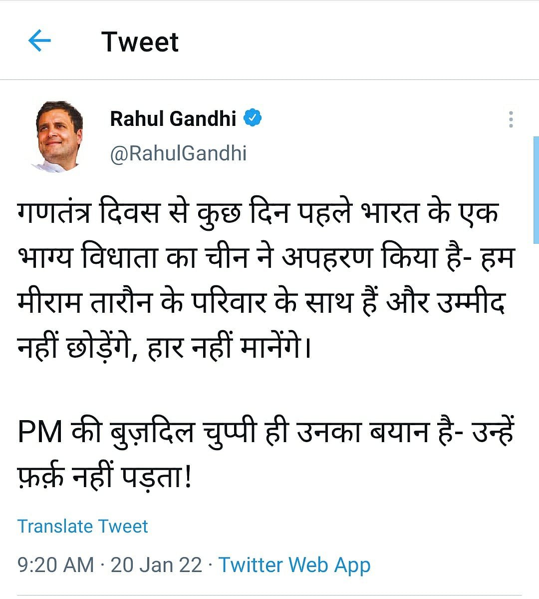 இந்த விவகாரம் தொடர்பாக காங்கிரஸ் எம்.பி ராகுல் காந்தி, தனது ட்விட்டர் பக்கத்தில், ``குடியரசு தினத்திற்கு சில நாள்களுக்கு முன்பு, இந்தியாவைச் சேர்ந்த சிறுவன் ஒருவன் சீனாவால் கடத்தப்பட்டான். நாங்கள் மிரம் தரோனின் குடும்பத்துடன் நிற்கிறோம், நம்பிக்கையைக் கைவிட மாட்டோம். தோல்வியை ஏற்க மாட்டோம். பிரதமரின் மௌனமே அவருடைய அறிக்கை. அவர் இந்த விவகாரத்தைப் பொருட்படுத்தவில்லை” என்று ட்வீட் செய்துள்ளார்.