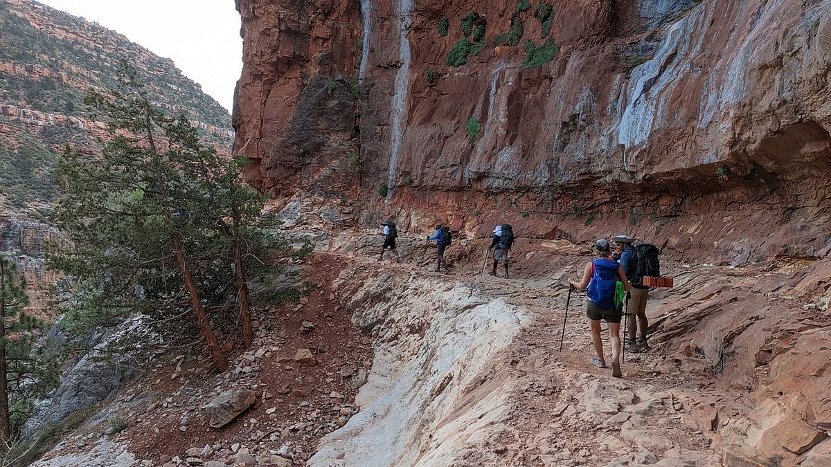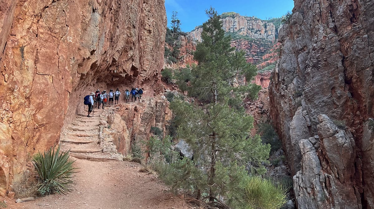 கிராண்ட் கேன்யனின் நடை பயணத்தில் கீழிறங்கி மேலேற (அல்லது தலைகீழ் மலை ஏறுதல்) மூன்று வழித்தடங்கள் உள்ளன. வடக்கு ரிம் பக்கத்தில் ஒன்று “வடக்கு கைபாப் டிரெயில்ஹெட்” என்று அழைக்கப்படுகிறது. தெற்கு ரிம் பக்கத்திலிருந்து இரண்டு. ஒன்று “தெற்கு கைபாப் டிரெயில்ஹெட்” மற்றும் இரண்டாவது “பிரைட் ஏஞ்சல் டிரெயில்ஹெட்” .