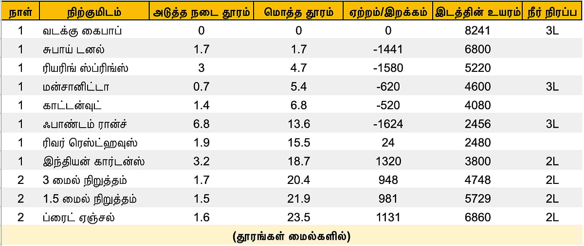 ஒரு குழுவாக நாங்கள் நன்றாக அட்டவணை போட்டு வைத்திருந்தோம். எங்கு நிறுத்த வேண்டும், எங்கு தண்ணீர் பையை மீண்டும் நிரப்ப வேண்டும் மற்றும் எங்கெங்கு ஓய்வெடுக்க வேண்டும் என்று. எங்கள் ஹெட்லேம்ப்களுடன் நாங்கள் உள்ளே நுழைந்தபோது, அதிகமான நட்சத்திரங்களுடன் வானம் அழகாக இருந்தது. மேலும் அட்ரினலின் உந்துதல், குழுவின் ஆதரவுடன் நாங்கள் 3500 அடிகள் இறங்கி காலை 7:45 மணி அளவில் மன்சானிட்டா என்ற இடத்திற்கு வந்தோம்.