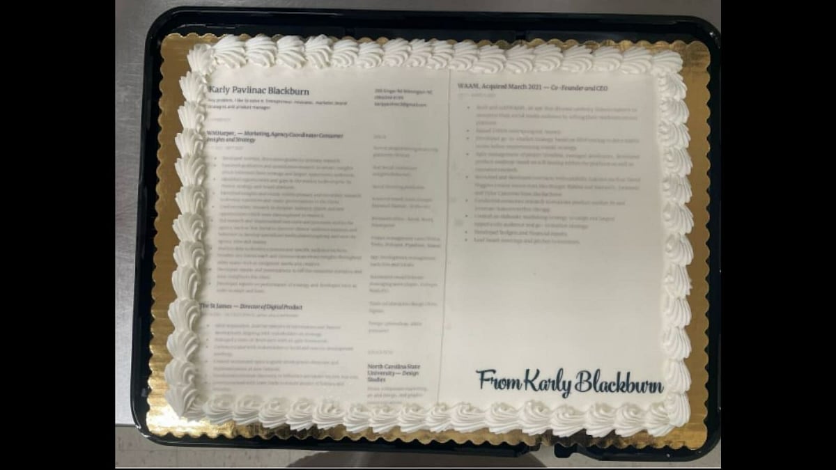 அமெரிக்காவின் வடக்கு கரோலினாவைச் சேர்ந்தவர் கார்லி பாவ்லினாக் பிளாக்பர்ன் (Karly Pavlinac Blackburn). இந்த பெண் நைக் நிறுவனத்தில் வேலை கிடைக்க வேண்டும் என்பதற்காக தனது ரெஸ்யூம்மை அந்த நிறுவனத்திற்கு அனுப்பி இருக்கிறார். ஆனால் அவர் பல முறை முயற்சித்தும் அவருக்கு அங்கு வேலை கிடைக்கவில்லை. இந்நிலையில் அந்த பெண் எப்படியாவது நைக் நிறுவனத்தில் வேலை வேண்டும் என்பதற்காக வித்தியாசமான முறையை கையாண்டுள்ளார். அவரின் தோழி கொடுத்த ஐடியா படி, ஓரிகானில் உள்ள பீவர்டனில் உள்ள நைக் நிறுவனத்தில் நிகழ்ச்சி நடைபெறும் சமயத்தில் அந்த பெண் ஒரு கேக்கை வாங்கி அதில் தனது தகவல்களை எழுதி ரெஸ்யூமாகத் தயார் செய்து அந்நிறுவனத்திற்கு அனுப்பி வேலைக்கு விண்ணப்பித்துள்ளார். மேலும், வழக்கத்திற்கு மாறாக கேக் மூலம் தனது ரெஸ்யூம்மை அனுப்பியதற்கான காரணத்தை அந்த பெண் LinkedIn-ல் பதிவிட்டுள்ளார்.