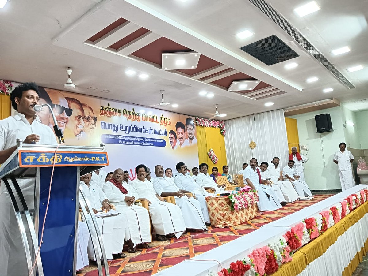 தஞ்சாவூர் தெற்கு மாவட்ட தி.மு.க சார்பில் பொது உறுப்பினர்கள் ஆலோசனைக் கூட்டம் பட்டுக்கோட்டையில் நடைபெற்றது. இதில் அமைச்சர் அன்பில் மகேஸ், எம்.பி பழநிமாணிக்கம், எம்.எல்.ஏ-க்கள், நிர்வாகிகள் உள்ளிட்ட பலர் கலந்துகொண்டனர்.